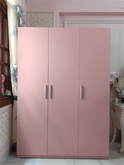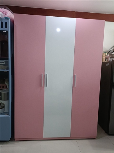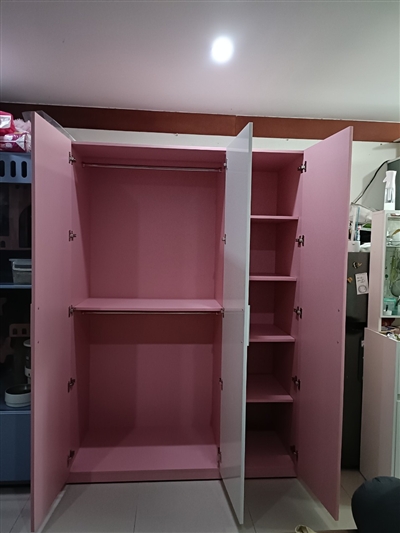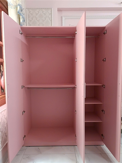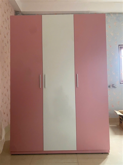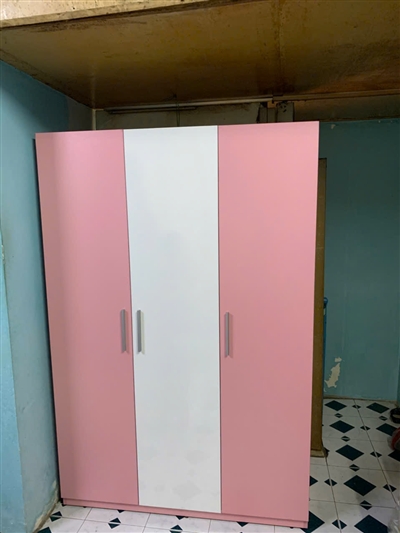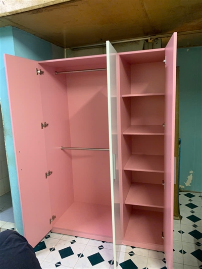 Tủ có thiết kế 3 cánh mở với màu hồng phối trắng thanh lịch, thời trang, gồm 1 khoang đôi lớn và 1 khoang đơn.