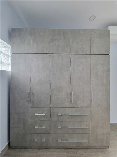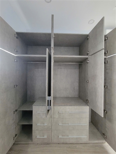 Tủ màu xi măng sang lắm, cao, chứa được nhiều đồ, tôi đỡ phải sắm thêm kệ, thợ thi công rất nhanh.