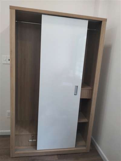 Nhân viên giao hàng đúng hẹn, lắp đặt cẩn thận, thái độ rất thân thiện. Tủ MDF cửa lùa dùng tiện, không chiếm diện tích khi mở cửa. Tủ khá chắc chắn, các ngăn bên trong rộng, để được nhiều đồ.