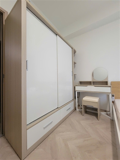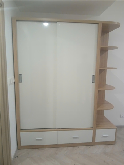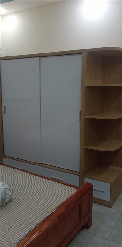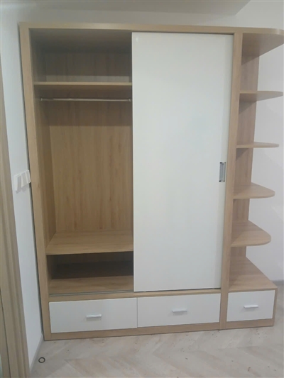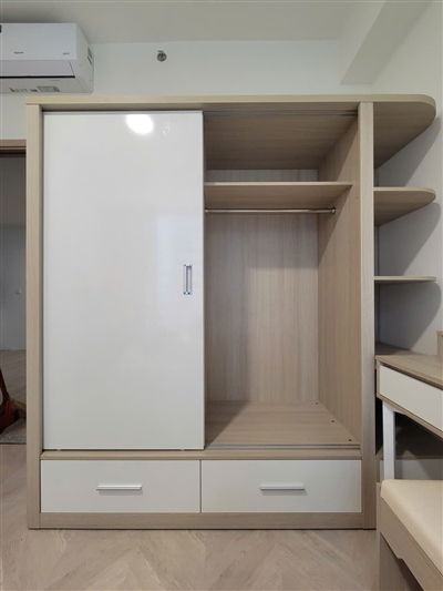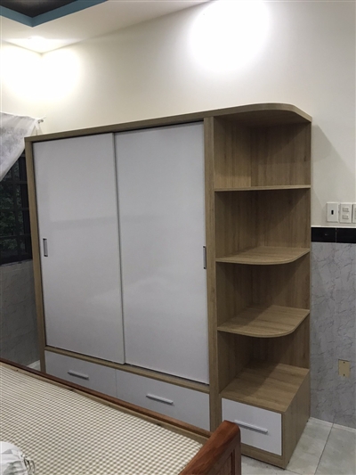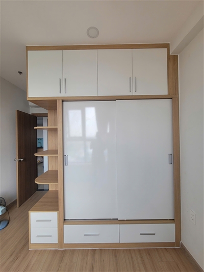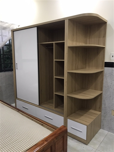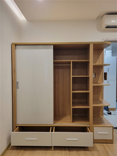 Tủ quần áo cửa lùa với kệ trang trí bên ngoài có các đặc điểm sau