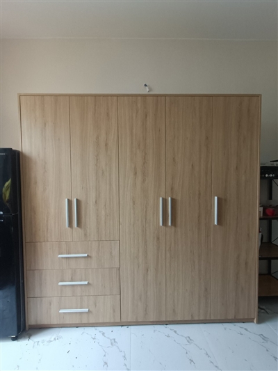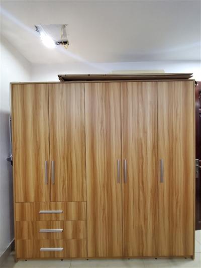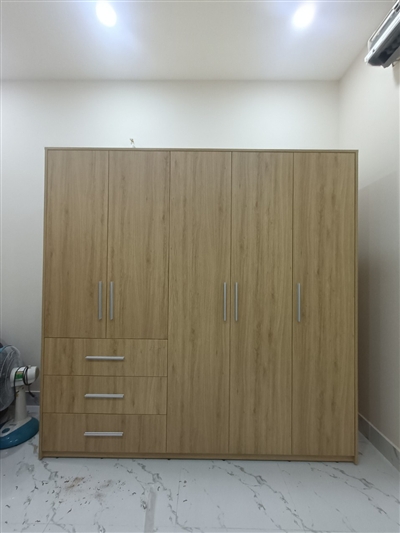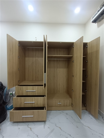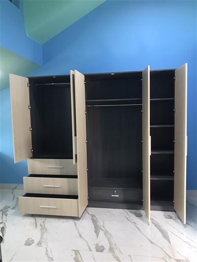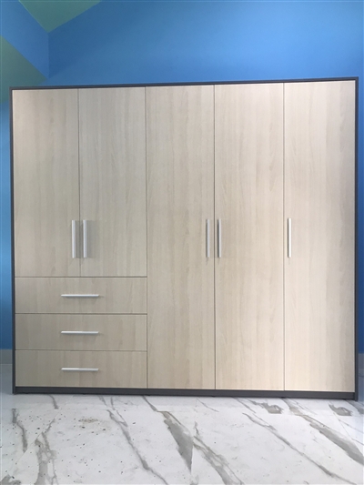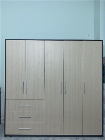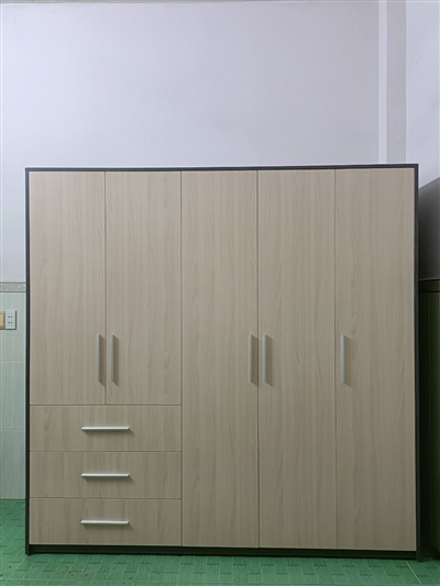 Tủ áo TQA-TP29 được phối màu gỗ đậm, nhạt độc đáo với thiết kế gồm 5 cánh mở có kích thước dài, ngắn khác nhau. Điểm nhấn là 3 hộc kéo lớn bên ngoài tiện dụng, đa năng chứa rất nhiều quần áo và các vật dụng khác khi cần thì lấy ngay mà không cần phải mở cánh tủ.