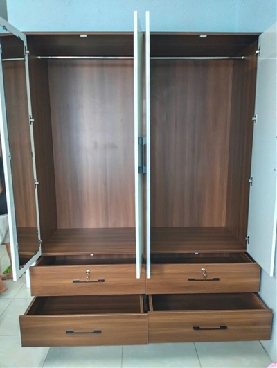 Tủ như quảng cáo luôn, 4 hộc kéo to chà bá. Bản lề giảm chấn, đóng mở êm, không gây tiếng động ban đêm