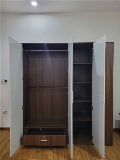 Tủ có thiết kế theo xu hướng hiện đại, sang trọng, với 3 cánh tủ mở, bên trong tủ được tính toán hợp lí, gồm các khoang đôi và khoang đơn, phân chia các ngăn trống dùng để quần áo xếp, khăn tắm, túi xách, giày dép…và gắn các thanh treo bằng inox dùng để treo quần áo, váy…, thoải mái, rộng rãi.