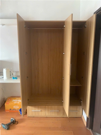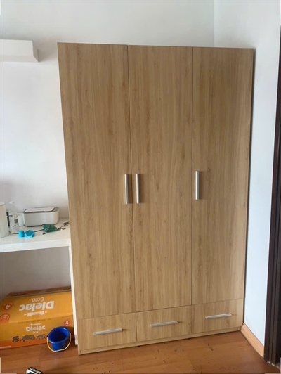 Thiết kế: 3 cánh mở, 2 ngăn treo, kệ gấp đồ, 3 hộc kéo tiện dụng.